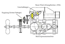 By 1931 Bremer Vulkan had supplied Huntingdon with a pair of Bauer-Wach exhaust turbines. Each turbine was powered by the exhaust steam from the low-pressure cylinder of one of her piston engines, and drove the same propeller shaft as that piston engine via a Föttinger fluid coupling. The turbines increased Huntingdon's fuel efficiency, and raised her total power to 1,270 NHP.[10]
