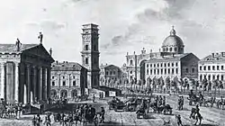 The Neoclassical headquarters of the Duma were erected on the main city avenue, Nevsky Prospekt, between 1784 and 1787. The famous Italianate tower was added in 1799–1804 to a design by Giacomo Ferrari. In 1847–52, the edifice was rebuilt in the Neo-Renaissance style, favoured by Nicholas I. Two more floors were added to the building in 1913–14. A spacious central hall of the City Duma was frequently let to host high-profile social events.