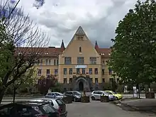 In January 1990, just after the Romanian Revolution, Salamon Ernő became a Hungarian-language school. Drawing, music and Romani language classes were introduced in 1998. The building was restored in 2001–2003, with language laboratories set up in the attic. In 2004, a tombstone carver restored the tree of life motif to the facade, based on the original plans. A new wing housing a Romanian high school opened in 2009. The Hungarian coat of arms was restored in 2011.[1] This sparked discussion at the national level, with Senator Lia Olguța Vasilescu writing to Education Minister Daniel Funeriu, asking for an explanation. He replied that he had approved the move, calling the seal a "façade ornament" not subject to laws governing the symbols of foreign countries.[2]