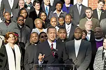 The debate highlighted disagreements between openly gay lawmakers and some black lawmakers on whether same-sex marriage is a matter of civil rights.[57] Delegate Emmett C. Burns, Jr. said: "If you want to compare same-sex marriage to civil rights as I know it, show me the Ku Klux Klan that invaded your home."[57] Delegate Keiffer J. Mitchell, Jr., grandson of NAACP chief lobbyist Clarence M. Mitchell, Jr.,[56] said "It is a civil rights issue when we as a state and a government deny equal protection under the law."[58] Several delegates who originally co-sponsored the bill began to express doubts after being lobbied by church-going constituents, including Sam Arora,[59] and Tiffany Alston, who delayed the bill's vote in the House committee by skipping the voting session.[55] The bill passed through the committee after its chairman, who rarely votes in committee, voted in favor.[55] The House majority whip opposed the bill.[55] Despite pleas from gay lawmakers, the House of Delegates voted to send the bill back to committee on March 11, 2011 and would not reconsider it before January 2012.[55]
