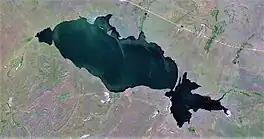 Saumalkol is an endorheic lake in the Shiderti basin, Kazakh Uplands. The lake is elongated and stretches in a roughly WNW/ESE direction for over 5 kilometers (3.1 mi). There is a 10 centimeters (3.9 in) to 15 centimeters (5.9 in) thick layer of silt at the bottom of the lake. Large swathes of the shoreline are covered with reeds. The western and southern sections of the lakeshore are rocky, while to the east and northeast there are swampy areas. The lake surface usually freezes in the first half of November and thaws by mid April.[4][3]