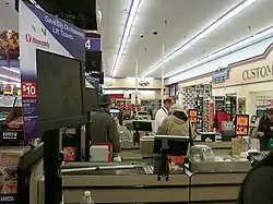 Checkout lanes inside a Save Mart (formerly an Albertsons) supermarket in Pacific Grove, California.
