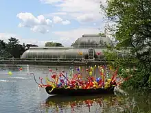 Glass may be used for sculpture through a wide range of working techniques, though the use of it for large works is a recent development. It can be carved, though with considerable difficulty; the Roman Lycurgus Cup is all but unique.[11] There are various ways of moulding glass: hot casting can be done by ladling molten glass into moulds that have been created by pressing shapes into sand, carved graphite or detailed plaster/silica moulds. Kiln casting glass involves heating chunks of glass in a kiln until they are liquid and flow into a waiting mould below it in the kiln. Hot glass can also be blown and/or hot sculpted with hand tools either as a solid mass or as part of a blown object. More recent techniques involve chiseling and bonding plate glass with polymer silicates and UV light.[12]