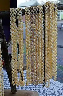 Shell jewelry is jewelry that is primarily made from seashells, the shells of marine mollusks. Shell jewelry is a type of shellcraft. One very common form of shell jewelry is necklaces that are composed of large numbers of beads, where each individual bead is the whole (but often drilled) shell of a small sea snail. Numerous other varieties of shell jewelry are made, including bracelets and earrings.