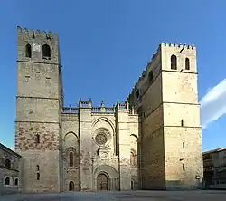 These towers, which were initially isolated, were built with defensive lookouts and later joined the wall. On both sides of the main façade, the two sandstone towers rise, with a square floor plan and three lower rooms with small Romanesque windows -one on each side- and in the fourth section with double windows with round arches. body with merlons and some stone spheres. The tower on the right, called "las Campanas", has a height of 40.5 meters, with an internal staircase of 140 steps, its last body was added in the 14th century, the bishop Pedro Gómez Barroso (1348 - 1358), who also had stone ashlar covered with the initial work, made in masonry and with the shields of the bishop and the king Peter of Castile placed on the wall of the fourth floor.[14] The tower on the left, called "Don Fadrique", has a height of 41.7 meters and was completed in the 16th century, has the date of 1533 and the inscribed coat of arms of the bishop Fadrique de Portugal.[15]