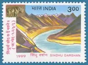 The Postal Department of Government of India issued a postage stamp depicting Sindhu Darshan Festival on 28 July 1999. The project 'Sindhu Darshan', was started to focus attention on the heritage of the ancient Indian Civilization and Culture that 'Sindhu' symbolizes. It aims to celebrate the Sindhu as a symbol of this country's ethnic diversity and to promote communal harmony. Further, attention is sought to be focused on cultural and topographical beauty of the landscape of Ladakh. These aspects are sought to be blended in the design of the First Day Cover which also carries inscription of the hymn 'mantra', chanted by Buddhists in the area, a prayer in praise of God. The stamp depicts a landscape in the upper reaches of the Sindhu with an inset of the 'Vrishabha' (bull) seal of the Indus Valley Civilization and a line, from the 'Rig Veda', describing the Sindhu River.
