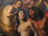 Queen Sophie Amalie is known as the hostess and central figure of the many grand representational parties that dominated Danish court life during her husband's reign. The Spanish envoy Rebolledo described her in this role at a party which was hosted in the honor of the queen's brother John Frederick at Jægersborg in 1655. After a deer hunt, where the royal couple participated similarly dressed in red and where "the queen conquered her skill to satisfy her generosity" by, as a good hostess, allowing the guests to win over her, a ball followed in which "the queen danced all night with such a smiling distance and such a majestic dignity, that she attracted the attention and appreciation of all".[1] She participated in the amateur theater and ballet at court and, in one famous occasion, performed five roles in the same ballet: as Fama, a maid, the Muse of war - "in which she danced while waving a banner to the music with such superior rhythm, that she seemed to exceed herself" - a Spanish lady and an Amazon; a performance during which the king asked the Spanish envoy Rebolledo of his opinion and was given the reply "happy is a nation with such a king, and happy is the king with such a queen."[1]