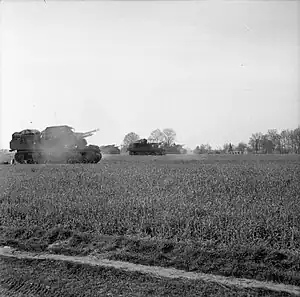 The 86th (East Anglian) (Hertfordshire Yeomanry) Field Regiment, Royal Artillery was mobilised in September 1939. In 1940 the regiment was equipped with 8 x 4.5 inch Howitzers & 4 x 18/25-pounder guns. On 18 November 1940 it formed an additional 343 Bty, renumbered as 462 Bty 18 January 1941.[100][101] It remained in the United Kingdom until 1944 being attached to various formations: 54th (East Anglian) Infantry Division from mobilisation until 9 June 1942, then 42nd Armoured Division until 3 May 1943,[101][109] during which time it was converted to self-propelled guns, first with the Bishop and then the Priest. When 21st Army Group was formed in July 1943 to prepare for the Allied invasion of Normandy (Operation Overlord), 86th (HY) Fd Rgt was assigned to I Corps.[110] When XXX Corps was brought back from Italy to spearhead the invasion, 86th (HY) Fd Rgt joined it, training with 50th (Northumbrian) Infantry Division in amphibious assault techniques for the Overlord landings including developing the technique of firing its Sexton SP guns from landing craft on the run-in to the beach. The regiment was among the first units to land on D-Day (6 June 1944).[101][111][112] It later supported various formations of XXX Corps throughout the campaign in North West Europe, including in Normandy, the liberation of Antwerp, Operations and Market Garden and Clipper, the Battle of the Bulge and the Reichswald battles (Operations Veritable and Blockbuster, the Rhine crossing (Operation Plunder) and the advance across Germany to Bremen.[101][113]