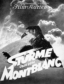 German: Stürme über dem Mont Blanc (aka en: Storm Over Mont Blanc) is a 1930 German film written and directed by Arnold Fanck and starring Leni Riefenstahl, Sepp Rist and Ernst Udet.[1] The film is part of the German film genre of "mountaineering", popularized by Fanck. The story revolves around a man who works alone at the Mont Blanc weather station gathering data. His only contact with the world below is via Morse code signals. He is joined by a woman friend, who helps him survive a terrible storm over the mountain.[2] Ernst Udet is featured as a pilot who is involved in a dangerous mountain rescue. [N 1]