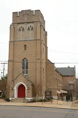 It is noted for its historic parish church located at Spring and Cottage Streets, completed in 1926 to replace the previous structure, which had been destroyed by a tornado.[2] The church is a stone Gothic Revival building designed by Thompson and Harding. Its gable-roofed nave is dominated by a massive buttressed stone tower at the front, topped by a tall parapet. A stained glass window is set in the tower, just above the projecting gable-roofed entrance vestibule.[3] It was listed on the National Register of Historic Places in 1982.[1]