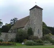 The church mentioned in the Domesday Book was replaced in the mid-13th century[3][4] by the present structure, which is the third[2] church on the site (a grassed area within the grounds of Preston Manor).[4] It consisted of a chancel, nave with no aisles and a tower at the west end with a shallow pyramidal cap (of the type known as a Sussex Cap),[4] corbel table and narrow lancet windows.[3][5] Its main feature of interest was a series of 13th- and 14th-century wall paintings around the chancel arch and the nave, which depicted the Nativity of Jesus, Saint Michael weighing the souls of the dead at the Last Judgment, the murder and martyrdom of Thomas Becket, Doubting Thomas, other saints, and the "Noli me tangere" scene at Jesus's Resurrection.[4][5][6][7][8] They were covered with plaster at the time of the Reformation and were rediscovered in 1830[2][8] by the vicar, Reverend Charles Townsend.[4]