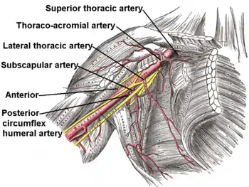 Axillary artery and its branches, including subscapular artery - anterior view of right upper limb and thorax.