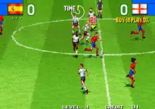 Upon starting the game, the player's team goes into a "Regional Qualifying Round Final" against another team from the same region. After beating it, the player's team goes into the World Cup Tournament, in which they are grouped with three other countries in a round-robin. After winning against all of them, the team enters an elimination tournament: the quarterfinals, semifinals, and the final for the World Cup, reminiscent of the real-life World Cup.[2] If a match ends in a draw, the player has the option of replaying a full game, going to the penalty kick tiebreaker, or playing a sudden death (golden goal) game; however, the arcade version requires an extra credit for these.
