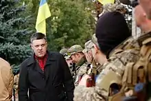 However, according to Polish lawyer and political scientist Tadeusz A. Olszański, Tyahnybok never concealed that these changes were made primarily for image purposes.[43] The party remained associated with the 'wide social nationalist movement' (consisting of numerous organisations and websites) and gathered around the Social-Nationalist Assembly which was set up in 2008. Yuri Mykhailyshyn, Tyahnybok's adviser who topped the list of Svoboda's Lviv branch in the 2010 municipal council elections, founded the Internet Joseph Goebbels Political Research Centre (the centre later changed Goebbels for Ernst Jünger) in 2005. Patriot of Ukraine, a paramilitary organisation dissolved in 2004 and re-established in 2005 in a different legal form, continued to maintain ties with Svoboda. It was not until 2007 that this paramilitary organisation announced the end of its relationship with Svoboda.[44] Even then, some prominent Svoboda members, such as Andriy Illienko from Svoboda's Kyiv branch, continued to identify themselves with the ideas of Patriot of Ukraine, which still uses the Wolfsangel symbol.[43]