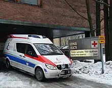 An Esperi Care ambulance in front of the trauma station of the Töölö Hospital.