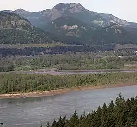 Table Mountain is a peak rising on the north side of the Columbia River in Washington state, about 4 miles (6.4 km) north-northwest of Bonneville Dam. It is one of the most spectacular landmarks of the Columbia River Gorge. Its southeast face drops 2,400 feet (730 m) in less than one horizontal mile (1.6 km.), and is topped by an almost vertical 800-foot (240 m) cliff.[3] Table Mountain is joined by the similar Greenleaf Peak to the northeast, and also by Hamilton Mountain to the southwest, which is lower, (2,438 ft or 743 m), but similarly steep and much closer to the Columbia. Together these peaks form an impressive group on the Washington side of the Gorge.