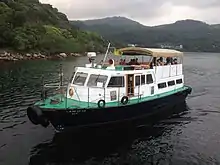 Boat arriving at Wong Shek Pier. Tai Tan is visible in the background.