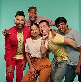 The final five players of the first season of The Circle. From left to right, the players in the photo are Chris Sapphire, Seaburn Williams (who played as "Rebecca"), Sammie Cimarelli, Joey Sasso, and Shubham Goel. Sasso ended up winning The Circle, and Cimarelli won the Fan Favorite award.