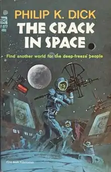 The Crack in Space is a 1966 science fiction novel by American writer Philip K. Dick. In the United Kingdom, it has been published under the title of the original novella, Cantata 140, published in the July 1964 issue of The Magazine of Fantasy & Science Fiction.[1] This original title refers to the short title in English, Sleepers Awake, of J.S. Bach's Cantata BWV 140 and the novel's 'bibs', the millions sleeping in suspended animation. Both are based on the short story Prominent Author.[2] The common elements are the Jiffi-scuttler transport device, the company, Terran Development, that manufactures it (and still exists to play a large role in the later works), and a brief summary of Prominent Author as an event of the past in chapter 2. The "crack in space" is a defect in Jiffi-scuttler operation that allows access to the earth (in Prominent Author) and to parallel earths (in the later works) at various times and locations, beyond its intended use of providing near-instant transport between specific locations on the earth in the present.