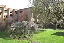 In 1961, Isi Metzstein and Andrew MacMillan of Glasgow-based firm Gillespie, Kidd and Coia were appointed to design accommodation for a further 1,000 students at The Lawns. They designed a series of twelve halls, each comprising five blocks identified by the letters A to E, and accommodating approximately 140 residents. A typical block configuration was three floors, with each floor accommodating nine students in seven rooms. The scheme was constructed between 1962 and 1968, when six of the projected twelve blocks were complete.[3] In that year, The Lawns was awarded a RIBA Bronze Regional Award.[4] In 1993, the six contemporary halls were designated as Grade II* listed buildings and are recorded in the National Heritage List for England, maintained by Historic England.[5][6][7][8][9][10]