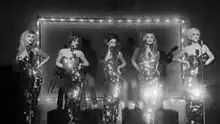 For their variety show The Girls Aloud Party, which aired between The X Factor's finale and its results show on 13 December, Girls Aloud wore tight silver fishtail dresses.[54] At the 2009 BRIT Awards, Girls Aloud performed in sleeveless sequined leotards. Accompanied by male dancers in white suits, the group performed a routine involving pink feather fans, giving the illusion of nudity until they emerged from behind the fans. The performance was nominated for Most Memorable Performance the following year at the 2010 BRIT Awards.[55]