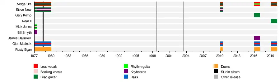 Rich Kids were formed in 1977 by bass player Glen Matlock after he left Sex Pistols. An early line-up consisted of keyboardist and guitar player Bill Smyth, Rusty Egan on drums, Steve New on lead guitar, and The Clash's Mick Jones, who acted as a session live player.[5] Glaswegian Midge Ure, whose band Slik had split up and reformed as the punk sounding PVC2, moved to London and joined Rich Kids.[6][7] Smyth left the group followed by Jones, who continued with The Clash.