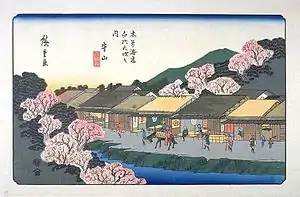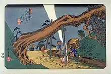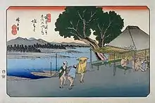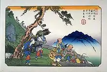 The Sixty-nine Stations of the Kisokaidō (木曾街道六十九次, Kisokaidō Rokujūkyū-tsugi) or Sixty-nine Stations of the Kiso Road, is a series of ukiyo-e works created by Utagawa Hiroshige and Keisai Eisen. There are 71 total prints in the series (one for each of the 69 post stations and Nihonbashi; Nakatsugawa-juku has two prints).