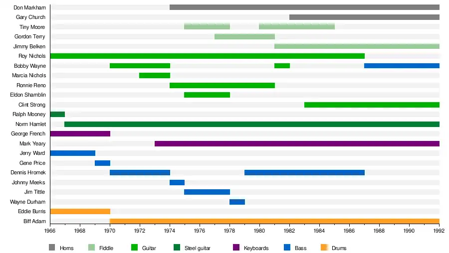 | Past members | Merle Haggard Biff Adam Paul Anastasio Johnny Barber Jimmy Belken Eddie Burris James Burton Glen Campbell Renato Caranto Jim Christie Gary Church Doug Colosio Eddie Curtis Iris DeMent Terry Domingue Floyd Domino Wayne Durham George French Johnny Gimble Ben Haggard Dana Haggard Noel Haggard Theresa Haggard Norman Hamlet Dennis Hromek Jeff Ingraham Scott Joss Red Lane Abe Manuel Joe Manuel Don Markham Randy Mason Will McGregor Johnny Meeks Eugene Moles Ralph Mooney Tiny Moore Marcia Nichols Roy Nichols Fuzzy Owen Bonnie Owens Gene Price Taras Prodaniuk Joe Reed Ronnie Reno Sheril Rodgers Eldon Shamblin Clint Strong Gordon Terry Jimmy Tittle Kenny Vernon Redd Volkaert Jerry Ward Bobby Wayne Mark Yeary |