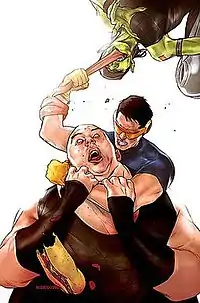 Toad's tongue wrapped around Cyclops' arm, while Cyclops is choking Blob.