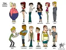In the early production stages, the character lineup had twelve contestants, and most of them had body shapes, colors, clothing, heights, hair styles and faces that were completely different from the final designs. The thirteenth character who was added later was B. His design was similar to that of the character in the Total Drama Island special as the man in the car when Courtney "discovered" civilization. That character also happened to be DJ's prototype from the original Camp TV promos.[25] Jo was later renamed to B (which stands for Beverly) while also getting his final design. The only other characters to have their name changed was Mary; she ended up using the name 'Jo'. Despite the rename, this character underwent the least amount of change in design. The other contestant who got renamed was Molly, being renamed to 'Zoey', while also carrying over her label. Anne Maria, Brick, Lightning, and Scott had minor modifications made to their outfits. Sam and Scott had different facial hair. The characters who had the most changes made to their designs were Dakota, Staci, and Zoey, who was originally named "Molly". Zoey's final design actually used the clothing and body shape from the original design for Dakota. Mike and Cameron had their ethnicities changed. Dawn, who was not in the original lineup, replaced an unused character named Zoey. Cameron's initial design would be reused for Jay and Mickey on Total Drama Presents: The Ridonculous Race.[3]
