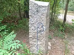 On the south side of Race Lane, just west of Trotter's Lane, at 41°41′11″N 70°26′12″W / 41.68639°N 70.43667°W, is a granite marker on the town line between Barnstable and Sandwich. The town line between these two towns was first laid out by the council of the Plymouth Colony in 1639, and has remained relatively stable since then. It is unknown when this rough granite marker was placed; on the street face it is marked with a B on the Barnstable side, and an S on the Sandwich side, with a carved vertical line between.[2] This marker was listed on the National Register of Historic Places in 1987 as "Town Boundary Marker".[1]