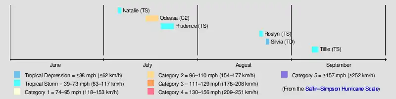 During this season only six tropical storms developed, of which two intensified into hurricanes. Of the two hurricanes, one reached Category 2 intensity of the Saffir-Simpson Hurricane Wind Scale. No storms reached major hurricane status (Category 3 or higher on the hurricane scale), an unusual occurrence. The first tropical cyclone of the season, Tropical Storm Natalie made landfall in Mexico in early to mid-July. About a week later, Hurricane Odessa became the strongest storm of the season in terms of wind speed. Tropical Storm Prudence brought high waves to Southern California, while becoming the strongest storm of the year in terms of barometric pressure. In addition, Tropical Storm Tillie produced severe flooding to much of the Southwestern United States, in particular in Arizona in early to mid-September.