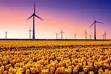 A modern-day field of tulips in the Netherlands; the flower remains a popular symbol of the Netherlands.