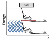 The device is operated by applying gate bias so that electron accumulation occurs in the intrinsic region for an n-type TFET. At sufficient gate bias, band-to-band tunneling (BTBT) occurs when the conduction band of the intrinsic region aligns with the valence band of the P region. Electrons from the valence band of the p-type region tunnel into the conduction band of the intrinsic region and current can flow across the device.[5] As the gate bias is reduced, the bands become misaligned and current can no longer flow.