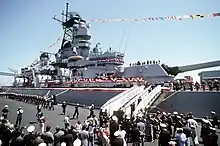 Missouri is 887 feet 3 inches (270.4 m) long overall and is 860 feet (262.1 m) long at the waterline. The ship has a beam of 108 ft 2 in (33 m) and a draft of 37 ft 9 in (11.5 m) at her full combat load of 57,540 long tons (58,460 t).[4] The Iowa-class ships are powered by four General Electric geared steam turbines, each driving one screw propeller using steam provided by eight oil-fired Babcock & Wilcox boilers. Rated at 212,000 shaft horsepower (158,000 kW), the turbines were designed to give a top speed of 32.5 knots (60.2 km/h; 37.4 mph), but were built to handle a 20 percent overload. None of the Iowa's ever ran speed trials in deep water, but the Bureau of Ships estimated that they could reach a speed of about 34 knots (63 km/h; 39 mph) from 225,000 shp (168,000 kW) at a light displacement of 51,209 long tons (52,031 t). The ships had a designed cruising range of 15,000 nautical miles (28,000 km; 17,000 mi) at a speed of 15 knots (28 km/h; 17 mph), although the New Jersey's fuel consumption figures during her sea trials suggest that her range was at least 20,150 nmi (37,320 km; 23,190 mi) at that cruising speed. Their designed crew numbered 117 officers and 1,804 enlisted men which had greatly increased by the end of the war in 1945.[5] Missouri's crew at that time numbered 189 officers and 2,978 sailors.[6]