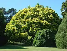 Before Dutch elm disease the tree was commonly cultivated in northern Europe.[9][10] The Späth nursery of Berlin marketed it in the late 19th century as U. campestris Louis van Houtte,[11] under which name it was introduced to the Dominion Arboretum, Ottawa, Canada, in 1898,[12] and to the Ryston Hall arboretum, Norfolk, UK,[13] (planted 1913).[14] In the UK the tree was supplied by Hillier & Sons Nursery of Winchester, Hampshire, as U. procera 'Vanhouttei' / 'Louis van Houtte'.[15] The tree appeared in the 1902 catalogue of the Bobbink and Atkins nursery, Rutherford, New Jersey, as Ulmus aurea Louis van Houtte,[16] and in Kelsey's 1904 catalogue, New York, as U. 'Louis van Houtte'.[17] It is less commonly cultivated in Australasia, where the golden wych elm Ulmus glabra 'Lutescens' has sometimes been mistakenly sold by nurseries under the name 'Louis van Houtte'.[18] The description, "The finest of the golden elms, with a large leaf of a clear golden colour", in the 1918 catalogue of the Gembrook or Nobelius Nursery near Melbourne, suggests 'Lutescens' rather than 'Louis van Houtte'.[19] Three trees in separate locations are known in the British Isles,[note 1] as well as a partial avenue in Aberdeen (see 'Notable trees').[20] The cultivar remains in commerce at a nursery in the US.