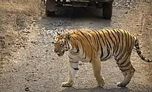 Mammal species such as the Bengal tiger, Indian leopard, gaur, blue bull, chital, sambar deer, barking deer, chinkara, monkey, wild boar, sloth bear and dhole live here.[4] The Wildlife Institute of India estimated the presence of three tigers in and around the sanctuary but the number has increased to five, with three new cubs sighted in March 2011. The field director of Umred Karhandla Wildlife Sanctuary said the 2011 births seemed to be the first litter of this tigress. "Better protection, good prey base and availability of water are three key factors why Bor is becoming a safe haven for tigers. Now the number of tigers has soared up steadily. The sanctuary now has three resident females rearing 10 cubs.,"[5] As per the 2015-16 tiger estimation report, there are five or six tigers in the Umred Karhandla Wildlife Sanctuary.[5]