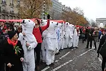Jens Galschiot's polar bear army during demonstration in Paris