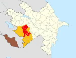 In the aftermath of the First Nagorno-Karabakh War, the Nagorno-Karabakh Republic, supported by the Republic of Armenia, took control over the territory of some 11,500 km2,[114] including several districts outside of the originally claimed borders of the Nagorno-Karabakh Autonomous Oblast of the Azerbaijani SSR, creating a "buffer zone".[115][94] Kelbajar and Lachin districts guarantee solid land corridor between Armenia proper and Nagorno-Karabakh.[116][94] Between 500,000 and 600,000 Azerbaijanis were displaced from the area.[117][118] In the meantime, almost all Armenians from Azerbaijan (between 300,000 and 400,000)[119][120] and Azerbaijanis from Armenia (over 150,000) were forced to move to their respective countries as remaining in their homes became nearly impossible since tensions between the two groups have grown worse since the start of the conflict in 1988.[121][122][123]