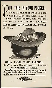 The UHU was founded and received a charter in the American Federation of Labor in 1896 through a merger of the International Trade Association of Hat Finishers of America and the National Hat Makers' Association of the United States.[1] One of its co-founders was John A. Moffitt, who served consecutively as UHU vice president, president, and editor of its official journal from 1896 to 1911.[2]
