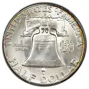 Sinnock reused the reverse for the Franklin half dollar, first struck in 1948, the year after his death. Mint and other publications gave credit for both coins' designs only to Sinnock until Don Taxay published his An Illustrated History of U.S. Commemorative Coinage in 1967, disclosing Lewis's involvement.[12] Taxay referred to "the Mint's ... final, deliberate misattribution of the artist who designed the half dollar"[10] and wrote, "perhaps after these forty years, it is time for a new credit line".[34] Bowers noted, "Lewis and Sinnock should share the credit."[12] R. S. Yeoman's A Guide Book of United States Coins (2015 edition) notes the involvement of both men, and values the half dollar at $90, with the quarter eagle beginning at around $450, though higher-graded coins may sell for more.[35] Many specimens of both coins are known in circulated condition.[13]