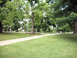 Old Main Lawn is an area surrounding Old Main on the University of Arkansas campus. Prior to 1872, the land was known as the McIlroy Farm. It was purchased for use as a university campus because of its prominence (the campus is still referred to as "The Hill"). In the late 1890s, part of the lawn was used as the university's first football field. Sheep were grazed on part of it. Agricultural students planted an oatfield on part of it.[9] The Lawn contains the earliest segments of Senior Walk, a concrete walking path that runs throughout the entire campus and contains the name of university graduates from every class since 1875. The lawn also contains the Spoofer's Stone, a piece of limestone that the builders of Old Main left in place after it fell out of an oxcart and broke. The stone was used as a meeting place for males and females during the 1880s when students of opposite sexes weren't allowed to mix.[10] The campus arboretum contains every tree found in the state of Arkansas. The Old Main Lawn area was enclosed by sandstone blocks in early 1900.[8]