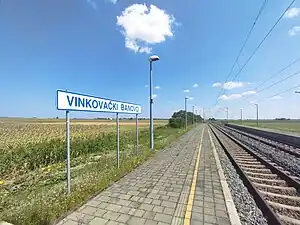 Vinkovački Banovci railway station (Croatian: Željeznička postaja Vinkovački Banovci, Serbian Cyrillic: Железничка станица Винковачки Бановци) is a railway station on Novska–Tovarnik railway in Croatia. The station is operated by Croatian Railways, the state-owned railway company. It is located at the northern edge of the village of Vinkovački Banovci.