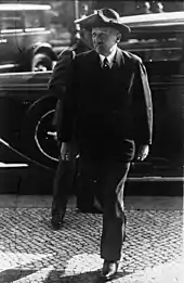 During the course of the winter of 1929–30, Schleicher undermined the "Grand Coalition" government of Hermann Müller by means of various intrigues, with the support of Groener and Hindenburg.[31] In January 1930, after receiving Zentrum party leader Heinrich Brüning's assent to heading a presidential government, Schleicher had told Brüning that the "Hindenburg government" was to be "anti-Marxist" and "anti-parliamentarian", and under no conditions were the Social Democrats to be allowed to serve in office, even though the SPD was the largest party in the Reichstag.[32] In March 1930, Müller’s government fell, and the first presidential government headed by Brüning came into office.[33] The German historian Eberhard Kolb described the presidential governments that began in March 1930 as a sort of 'creeping' coup d'état, by which the government gradually become more and more authoritarian and less and less democratic, a process that culminated with the Nazi regime in 1933.[34] The British historian Edgar Feuchtwanger called the Brüning government Schleicher's "brainchild".[35]