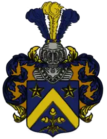 The shield is in the form of "Tiercé en chevron", which was a symbol of protection and conservation, martial valor, resistance and strength.[9] The tincture of the coat of arms is held in blue and gold. The golden rafter is accompanied above by two golden stars. Below is a bundle of three golden acorns tied together with a golden ribbon. The helmet is held in silver and has seven grids. The crest consists of a golden between two blue ostrich feathers. In addition, the helmet is surrounded by blue-golden blankets.