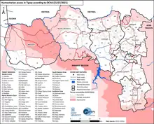 Restricted humanitarian access in Tigray due to the war (July 2021); the darkest shade of red is for areas that are considered inaccessible.