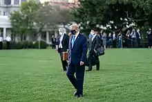 At 12:54 a.m. EDT on October 2, Trump announced via Twitter that both he and the first lady had tested positive for the SARS-CoV-2 virus that night.[148][149] The afternoon of the same day, the White House announced that Trump would be hospitalized at Walter Reed National Military Medical Center in Bethesda, Maryland "for the next few days" "out of an abundance of caution", on the recommendation of the medical team headed by Sean Conley, a Doctor of Osteopathic Medicine who had been the Physician to the President since 2018. Because he was a Navy commander, Conley was obliged to follow the orders of his commander-in-chief.[41] Trump, who was wearing a mask, was briefly filmed walking unassisted from the White House to the Marine One helicopter outside to transport him to Walter Reed.[135] According to White House Chief of Staff Mark Meadows, Trump was hospitalized because he "had a fever and his blood oxygen level had dropped rapidly".[150] The Associated Press reported that "a person familiar with Trump's condition confirmed that Trump was given oxygen at the White House" in the morning before arriving at Walter Reed, although Trump's doctors refused to say whether he had ever been given supplemental oxygen.[151]