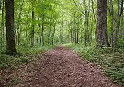 In the 1850s the federal government began building the Point Douglas to Superior Military Road. Although intended as a highway for troop movement, this route from Hastings, Minnesota to Superior, Wisconsin was one of the first roads in the territory and attracted a flood of civilian and commercial traffic. When Minnesota achieved statehood in 1858, responsibility for the road devolved to the state, which did not have the funds to finish the project. Although very rough and in places incomplete, the road was still the best route north until railroads were built in 1870. A 1.2-mile (1.9 km) segment was still in evidence when Wild River State Park was established and was incorporated into the park's trail system. The road segment begins in a clearing just south of Deer Creek and forms the eastern leg of the Deer Creek Loop trail along the St. Croix River. Where the hiking trail veers away to loop back north, the road fragment continues as a maintenance access road for 2,500 feet (760 m) to the southeastern corner of the park boundary.[3] Traces of the Point Douglas to Superior Military Road can also be seen in Minnesota's Banning State Park.