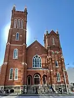 One of the first projects Parkins worked on in Atlanta was designing the Catholic Church of the Immaculate Conception in downtown Atlanta.[25][31] The original church building at the site had been constructed in 1848 and had been one of the few structures in the city not destroyed by Union soldiers under General William Tecumseh Sherman during the war.[32] Despite being saved from destruction, the building was still severely damaged, leading church officials to construct a new building designed by Parkins.[32] The Reverend Abram Joseph Ryan laid the cornerstone on September 1, 1869.[31] The building was completed and dedicated in 1873.[31][32] The building is an example of Gothic Revival architecture,[31] with the design heavily influenced by French Gotchic and High Victorian Gothic styles.[33] The building would later be rededicated as a shrine in 1954.[34] During his early career, Parkins would design several other churches, including First Methodist and Second Baptist, though all of these buildings except for the Shrine of the Immaculate Conception have since been demolished.[35] Both the Catholic and Methodist church were designed in the Gothic Revival style and helped cement Parkins as one of the leading architects in the state.[1] In the late 1860s, he also designed an opera house on Marietta Street.[36] In 1868, the building was sold by businessman Hannibal Kimball to the state government,[37] who used it as a capitol building until the Georgia State Capitol was completed in 1889.[36]