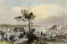 In 1835, Bartlett first visited the United States to draw the buildings, towns and scenery of the northeastern states. The finely detailed steel engravings Bartlett produced were published uncolored with a text by Nathaniel Parker Willis as American Scenery; or Land, Lake, and River: Illustrations of Transatlantic Nature. American Scenery was published by George Virtue in London in 30 monthly installments from 1837 to 1839. Bound editions of the work were published from 1840 onward.[1] The same publisher produced The Poems, Letters and Land of Robert Burns with engravings by Bartlett in 1838. In that same year Bartlett was in the Canadas producing sketches for Willis' Canadian Scenery Illustrated, published in 1842. Following a trip to the Middle East, he published Walks About the City and Environs of Jerusalem in 1840.